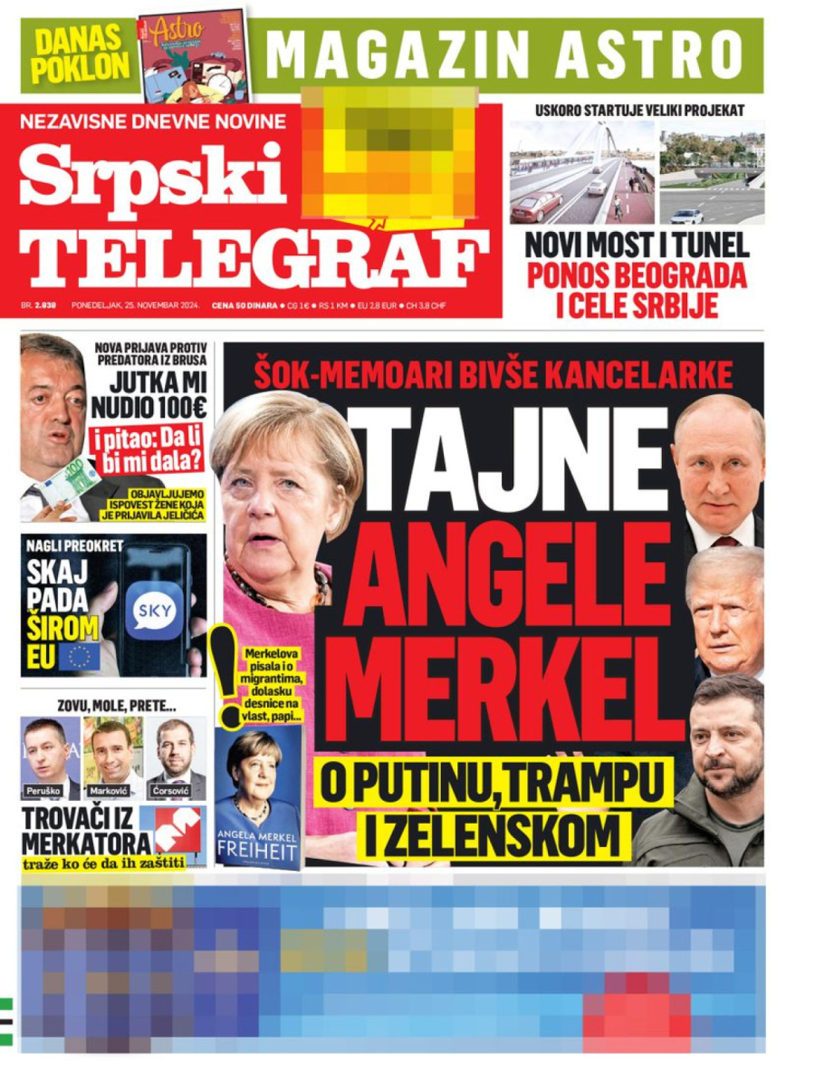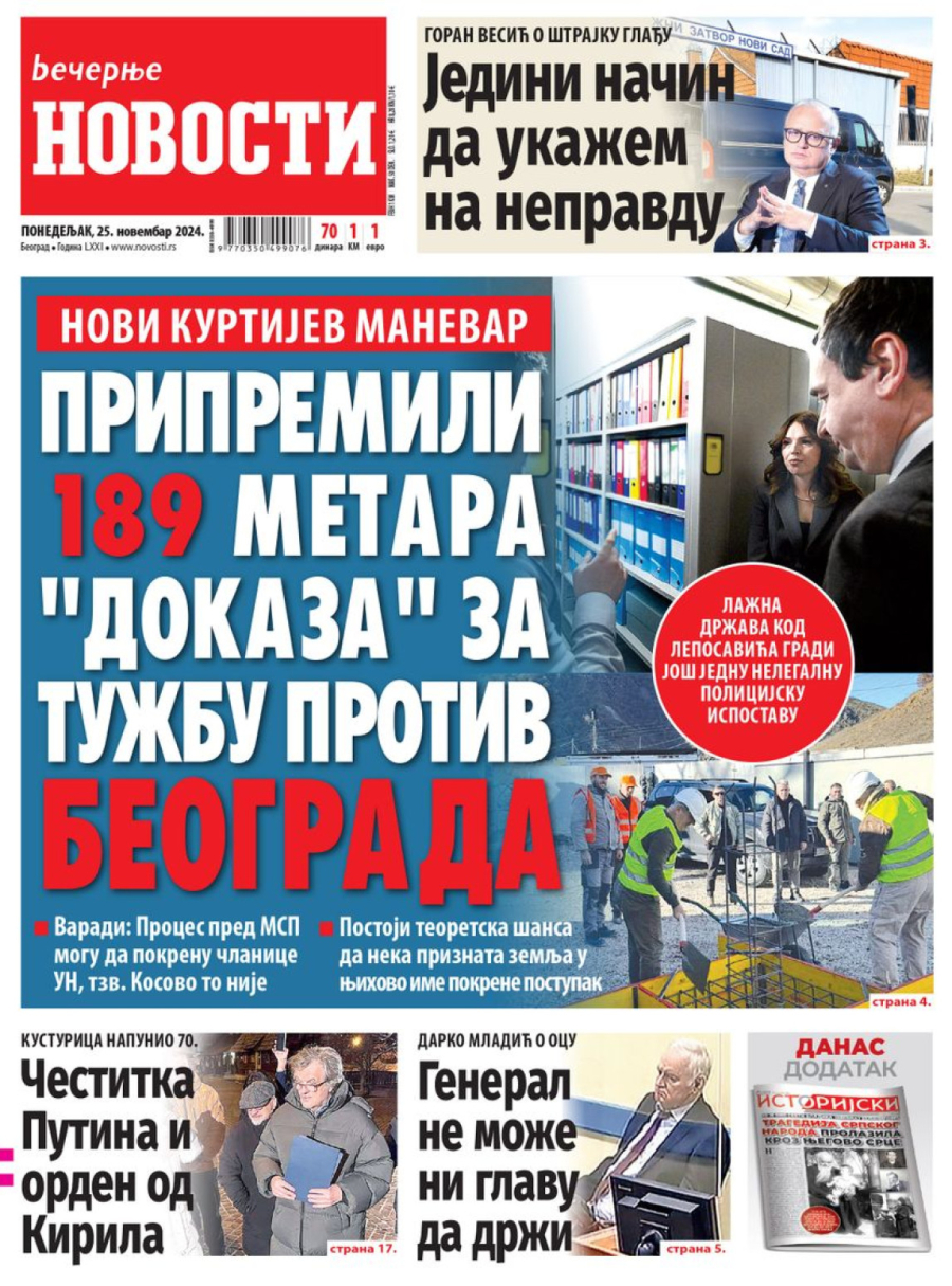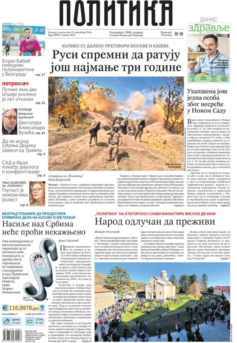 Dnevne novine u Srbiji za ponedeljak, 25. novembar 2024. godine, na naslovnim stranama najavljuju brojne aktuelne društveno-političke teme i donose ekskluzivne priče.