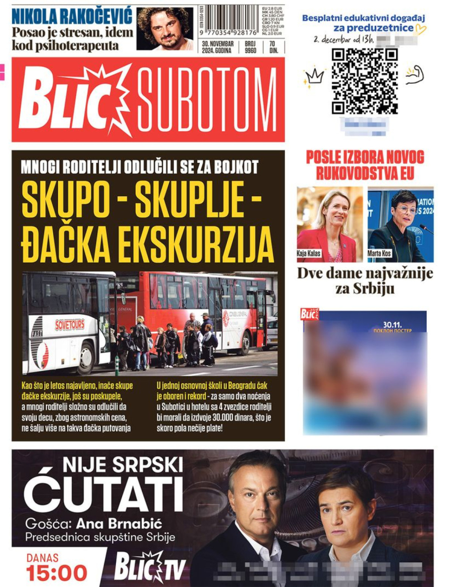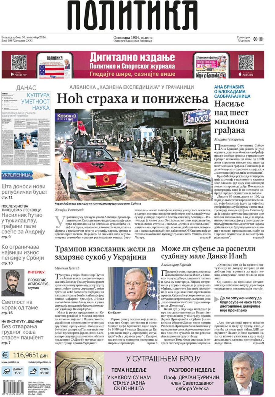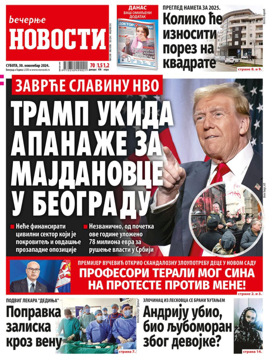 Dnevne novine u Srbiji za subotu, 30. novembar 2024. godine, na naslovnim stranama najavljuju brojne aktuelne društveno-političke teme i donose ekskluzivne priče.