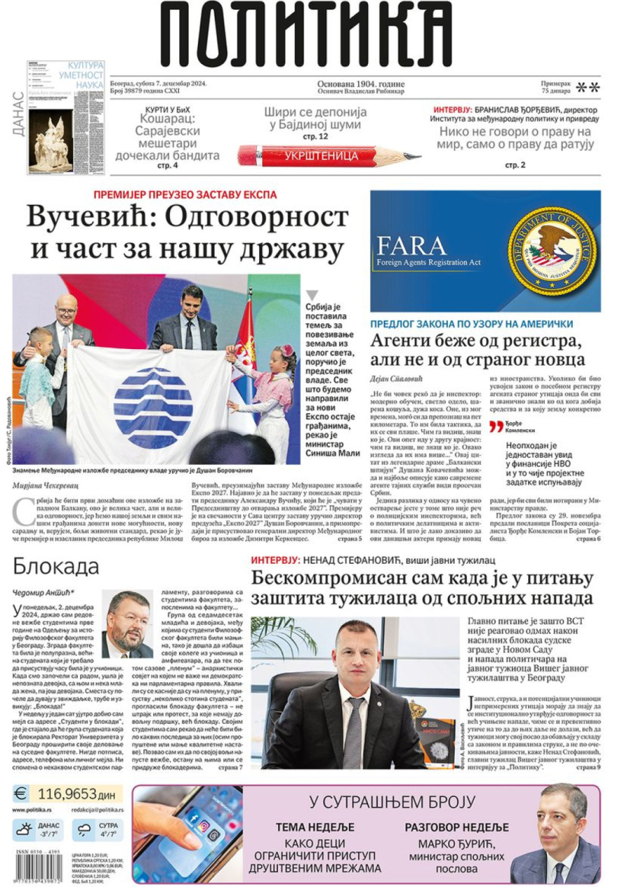 Dnevne novine u Srbiji za petak, 7. decembar 2024. godine, na naslovnim stranama najavljuju brojne aktuelne društveno-političke teme i donose ekskluzivne priče.