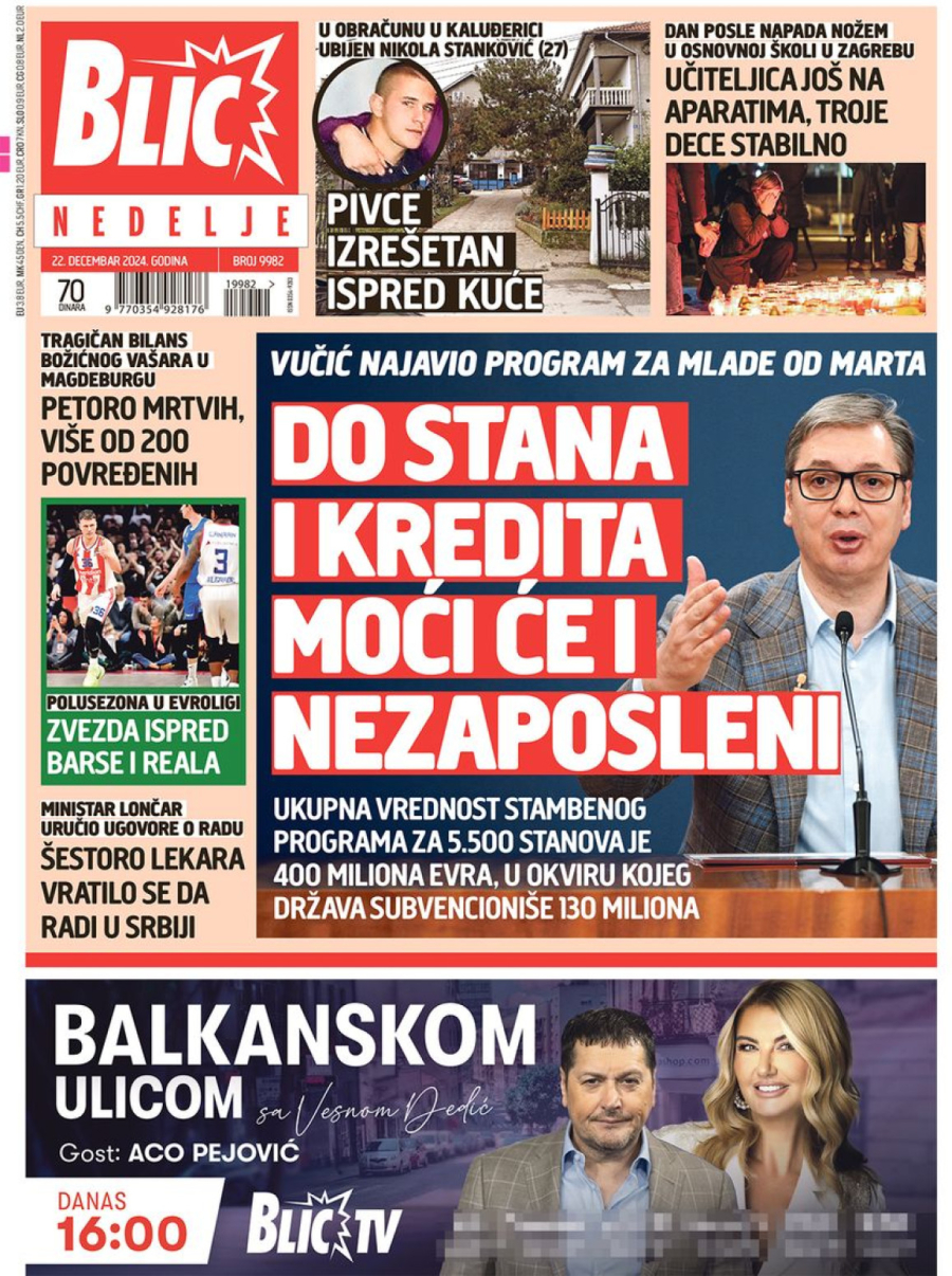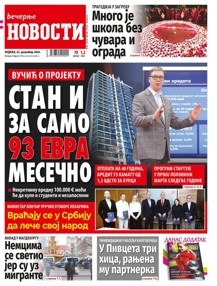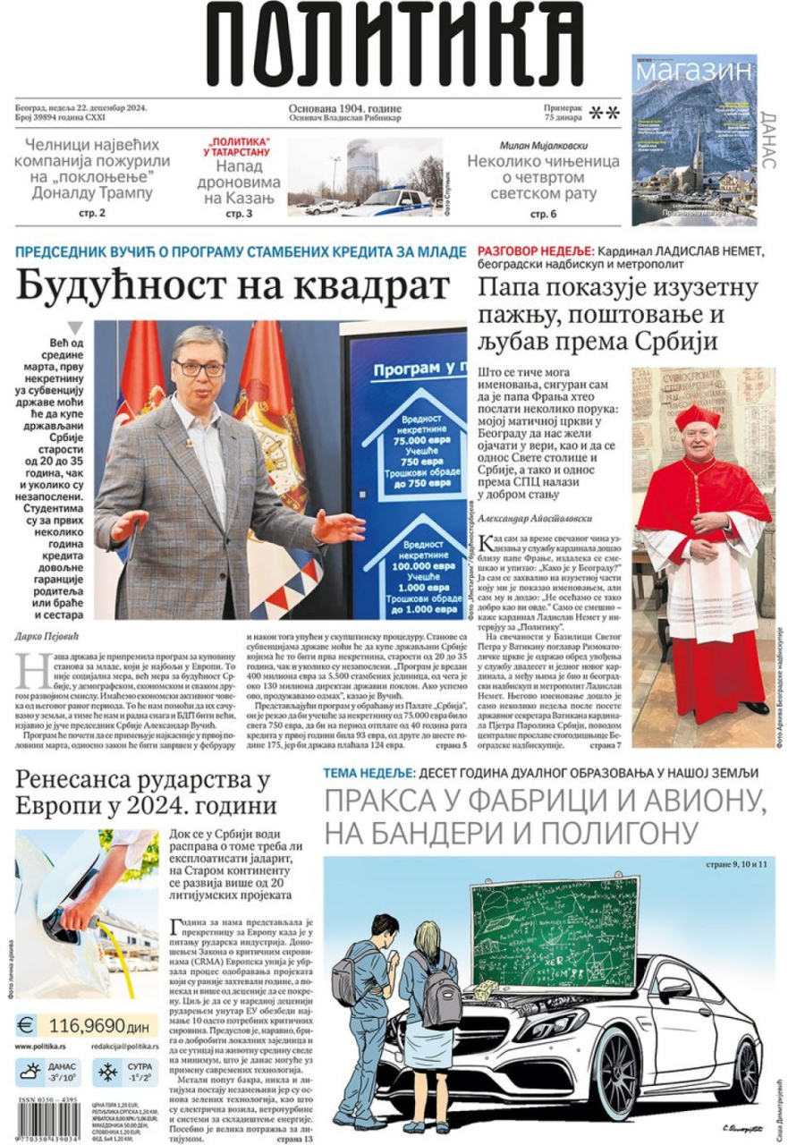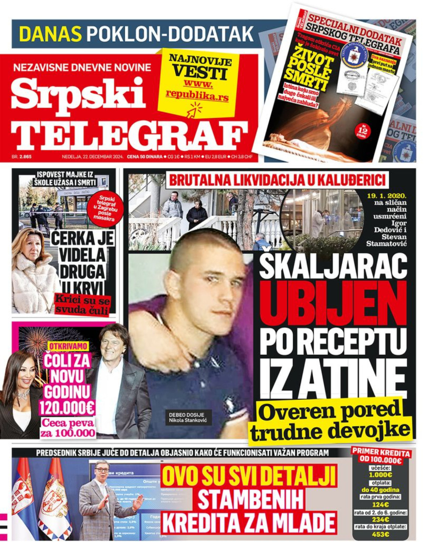 Dnevne novine u Srbiji za nedelju, 22. decembar 2024. godine, na naslovnim stranama najavljuju brojne aktuelne društveno-političke teme i donose ekskluzivne priče.