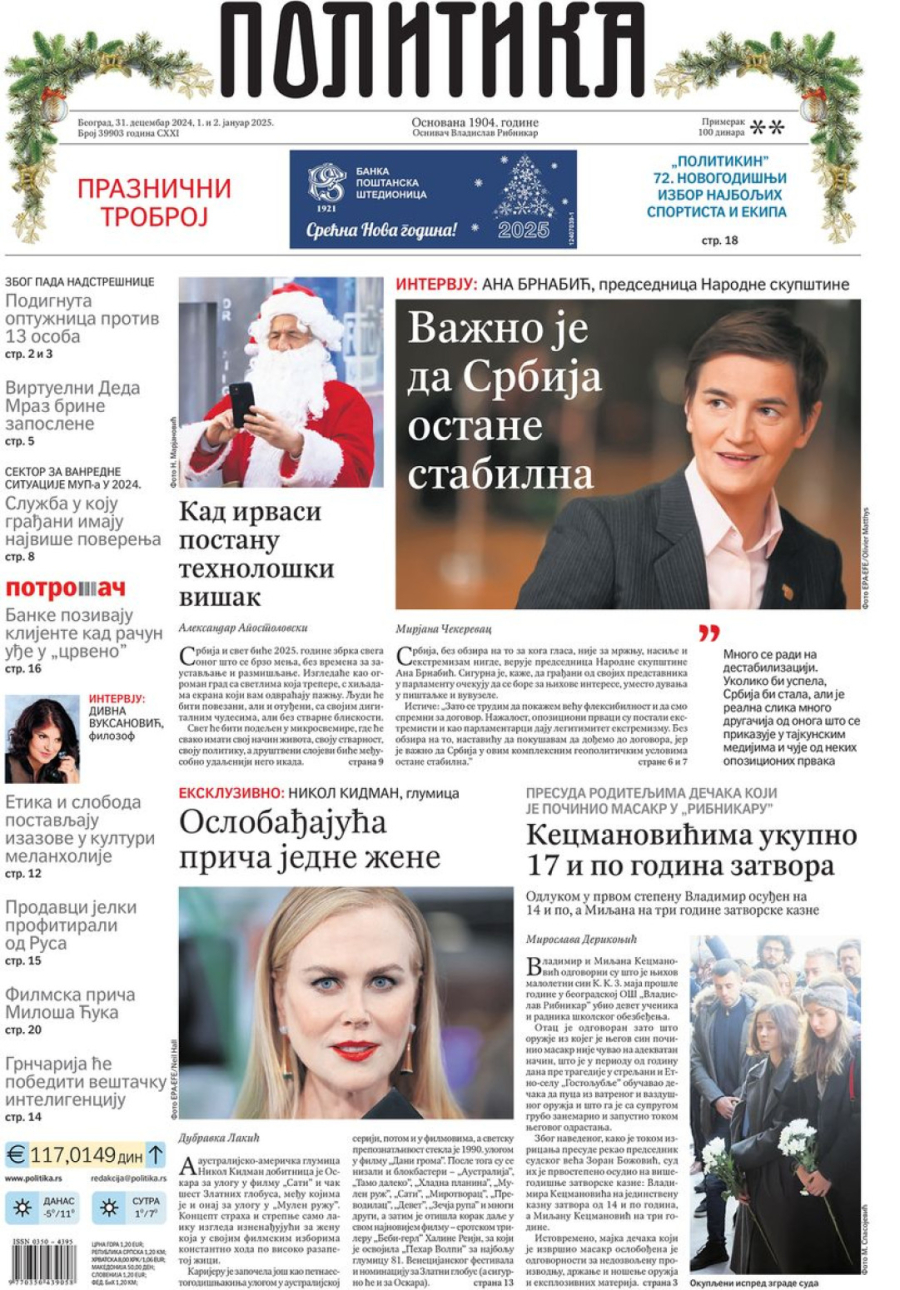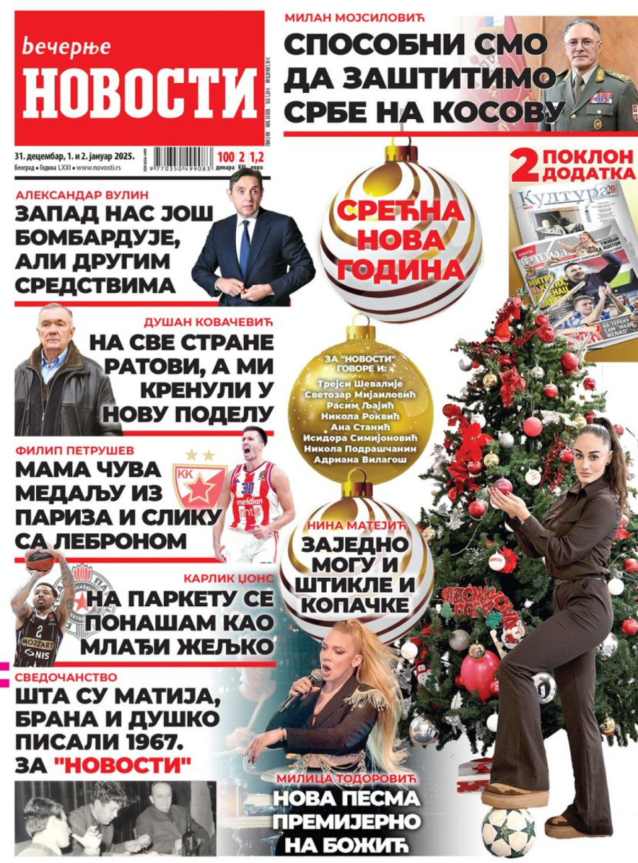 Dnevne novine u Srbiji za utorak, 31. decembar 2024, sredu, 1. januar i četvrtak, 2. januar 2025. godine, na naslovnim stranama najavljuju brojne aktuelne društveno-političke teme i donose ekskluzivne priče.
