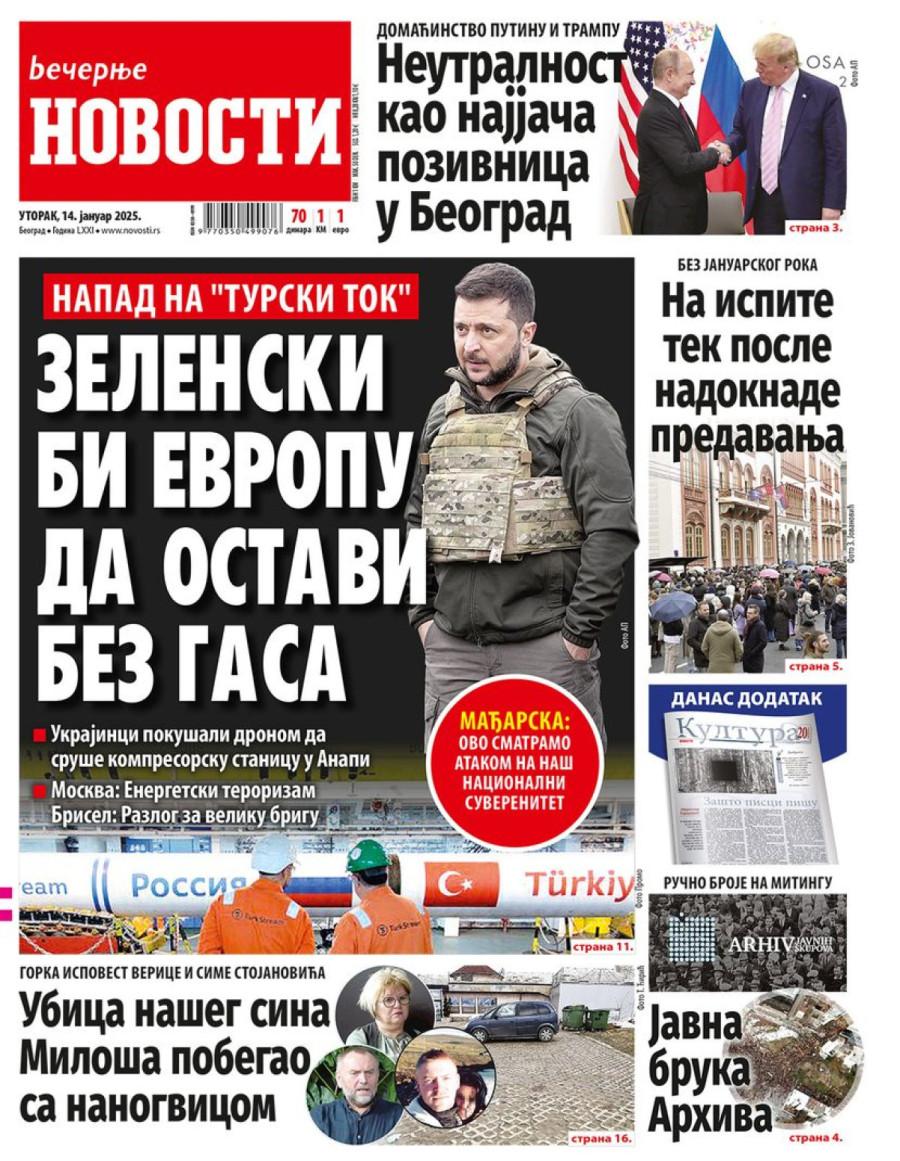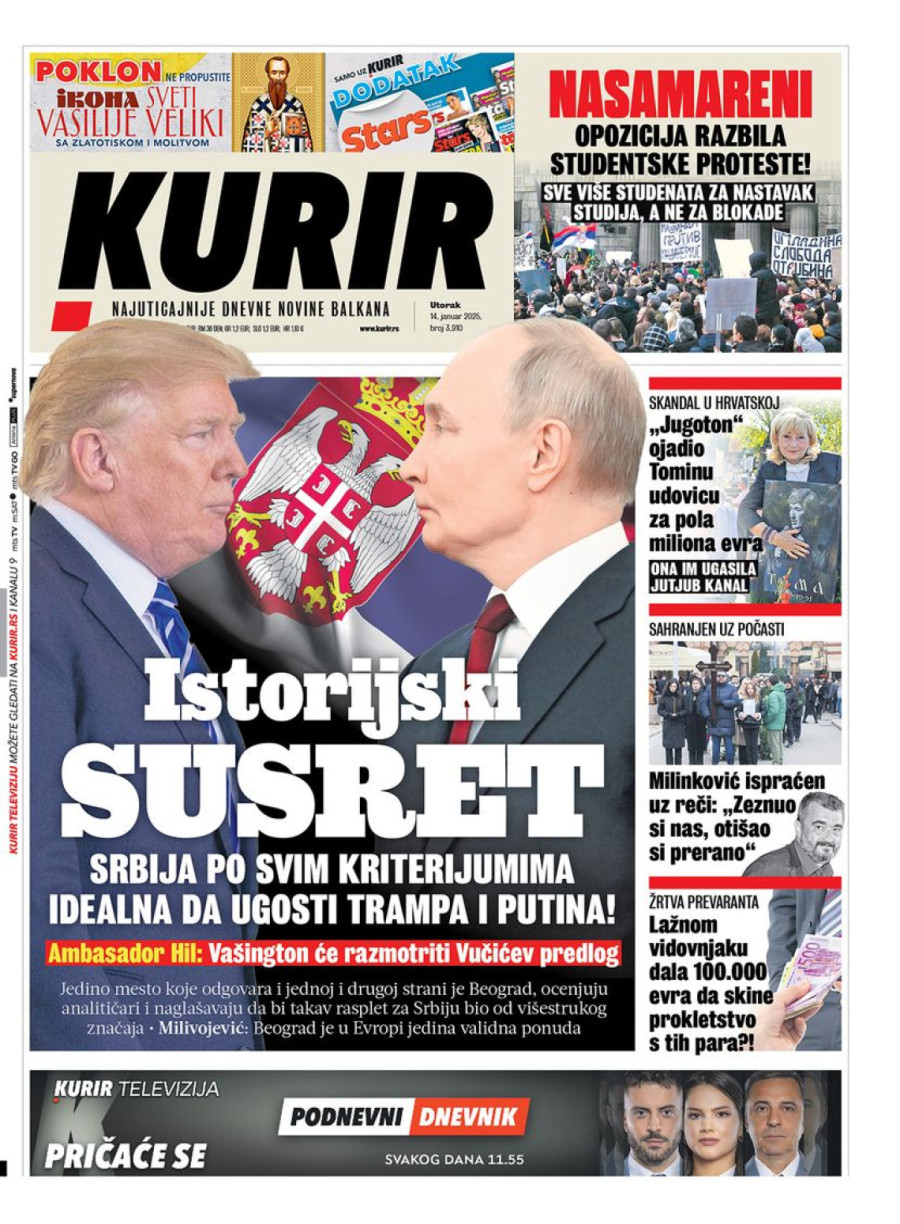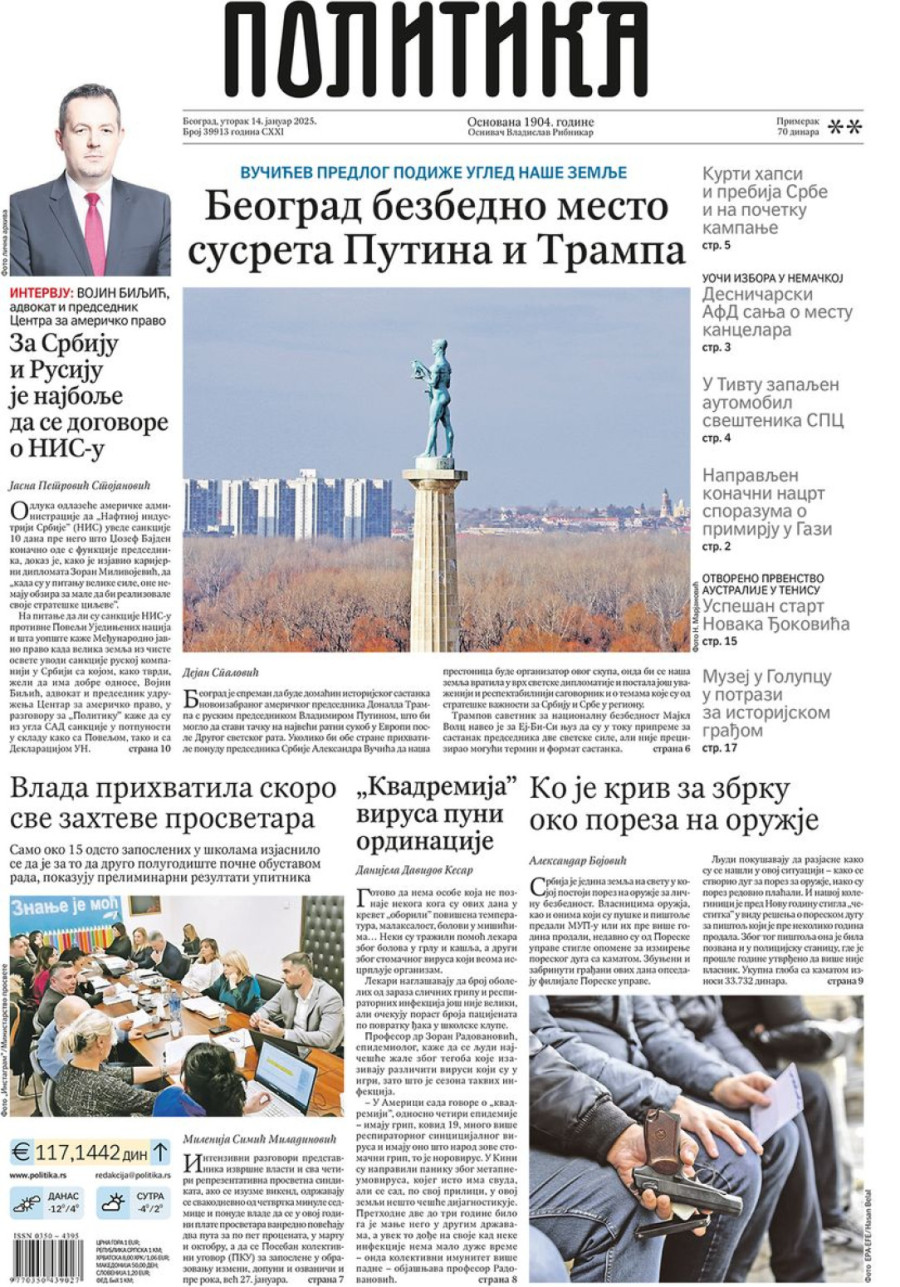 Dnevne novine u Srbiji za utorak, 14. jaunar 2025. godine, na naslovnim stranama najavljuju brojne aktuelne društveno-političke teme i donose ekskluzivne priče.