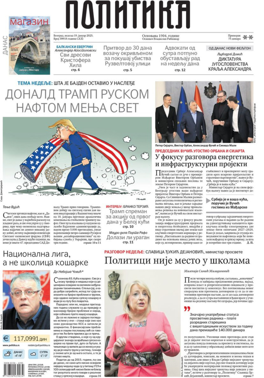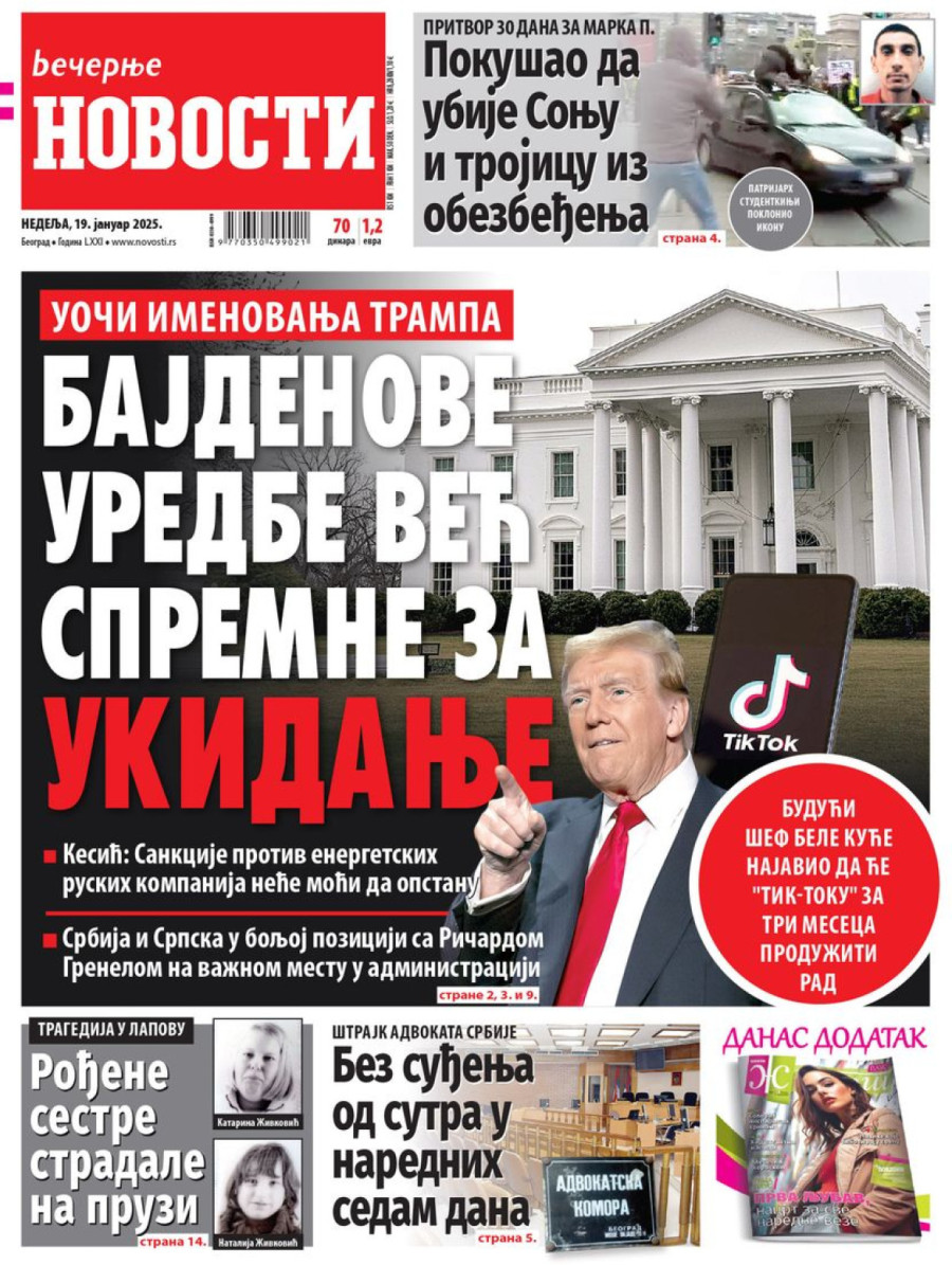 Dnevne novine u Srbiji za nedelju, 19. jaunar 2025. godine, na naslovnim stranama najavljuju brojne aktuelne društveno-političke teme i donose ekskluzivne priče.