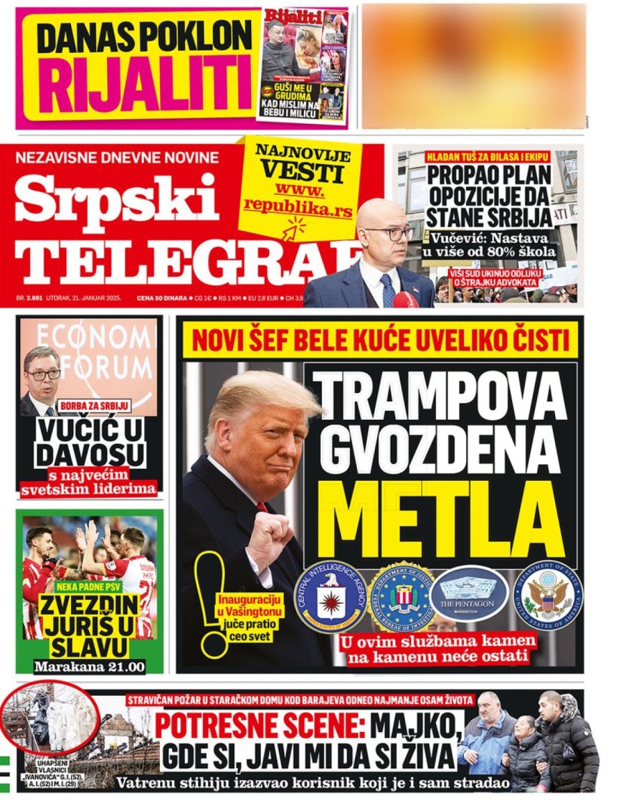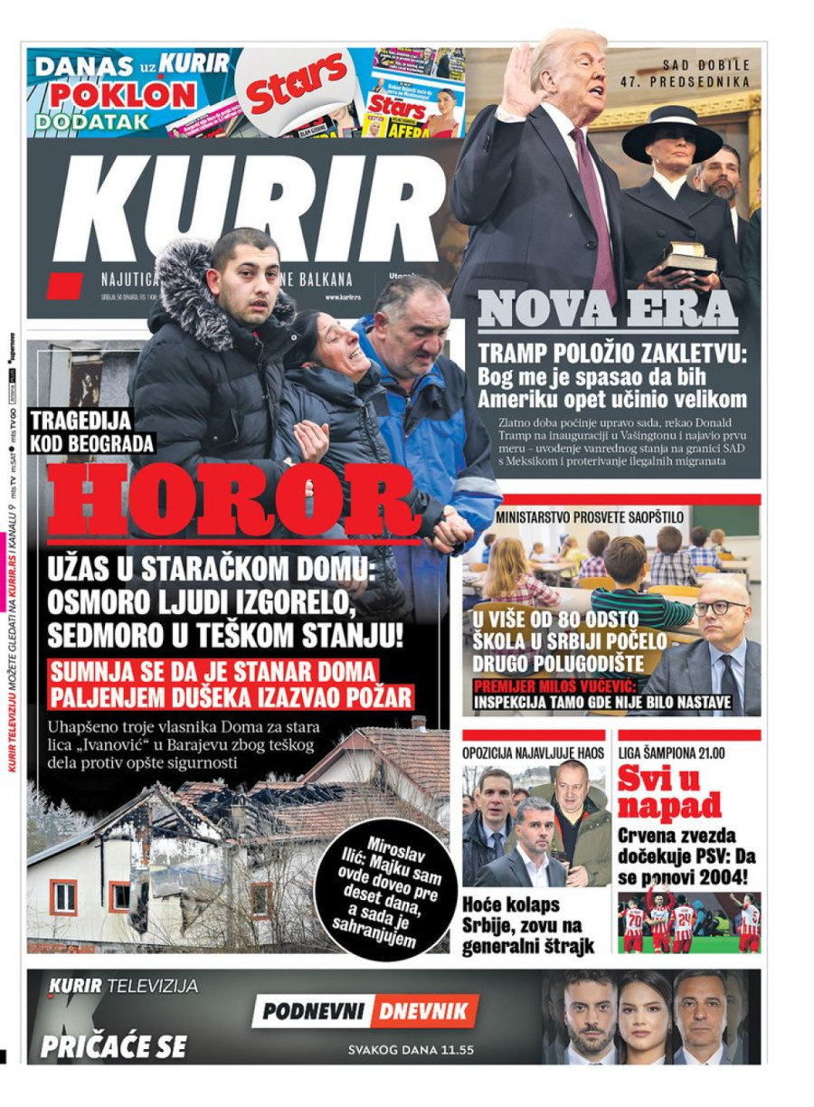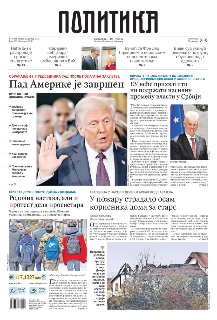 Dnevne novine u Srbiji za utorak, 21. januar 2025. godine, na naslovnim stranama najavljuju brojne aktuelne društveno-političke teme i donose ekskluzivne priče.