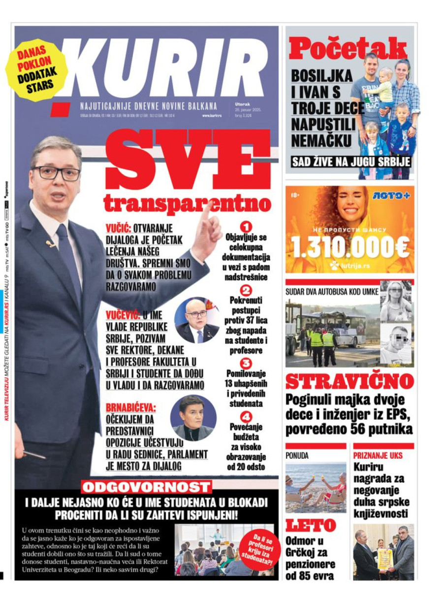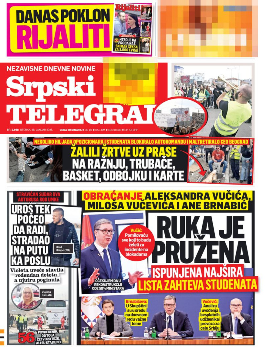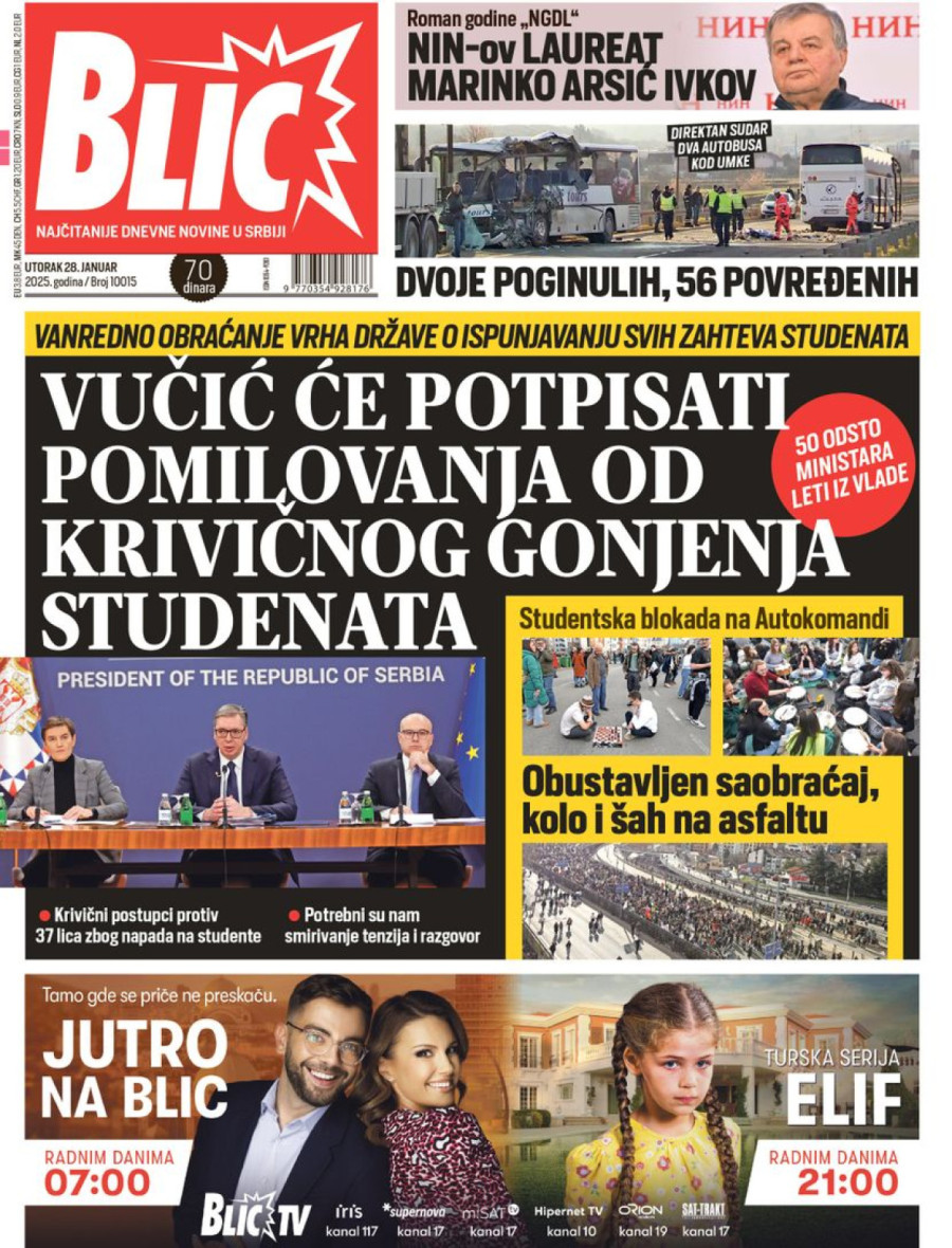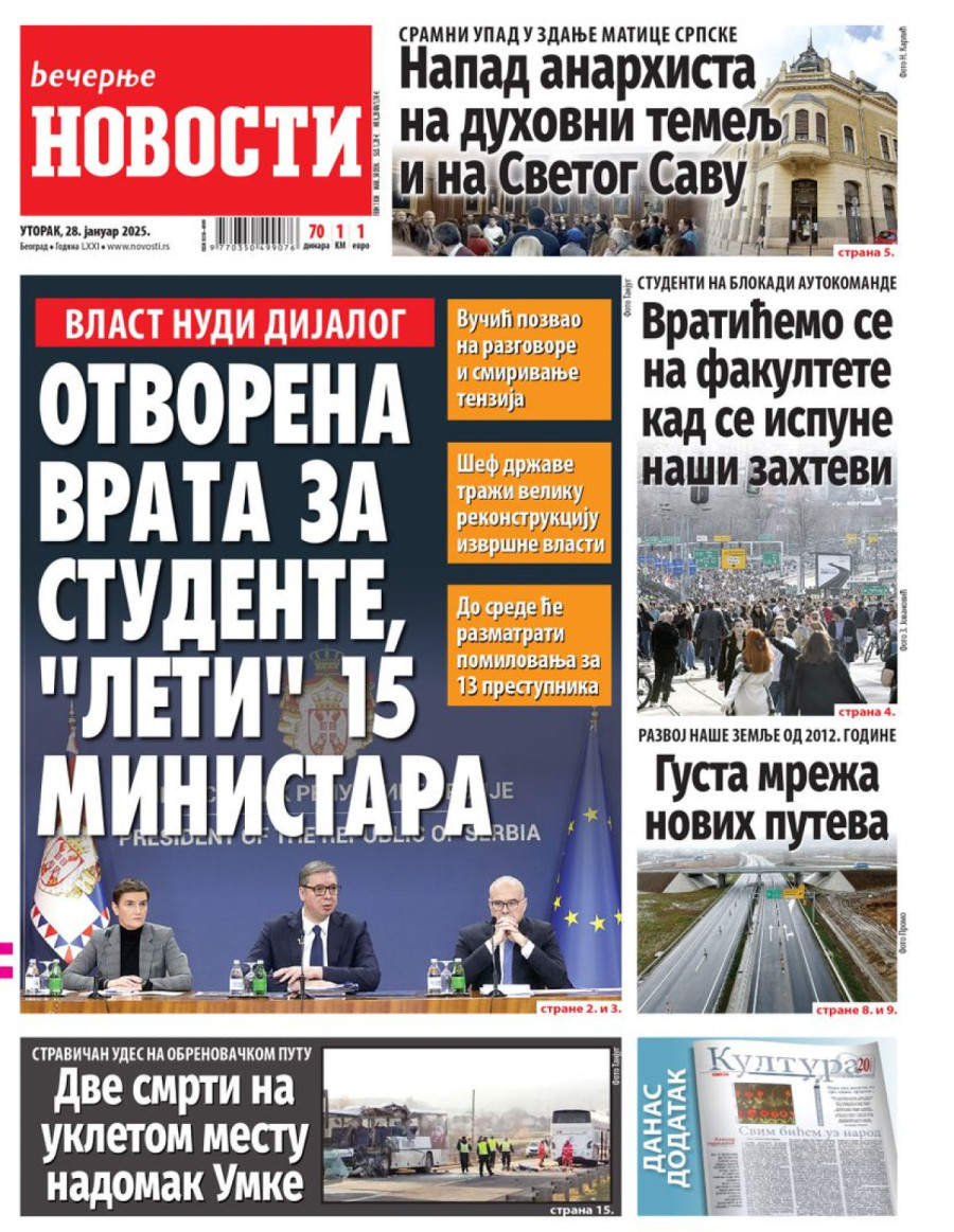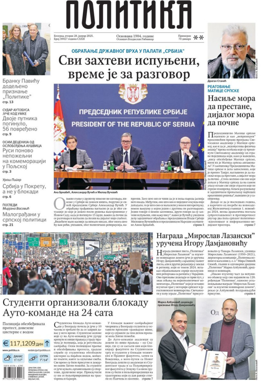 Dnevne novine u Srbiji za utorak, 28. januar 2025. godine, na naslovnim stranama najavljuju brojne aktuelne društveno-političke teme i donose ekskluzivne priče.