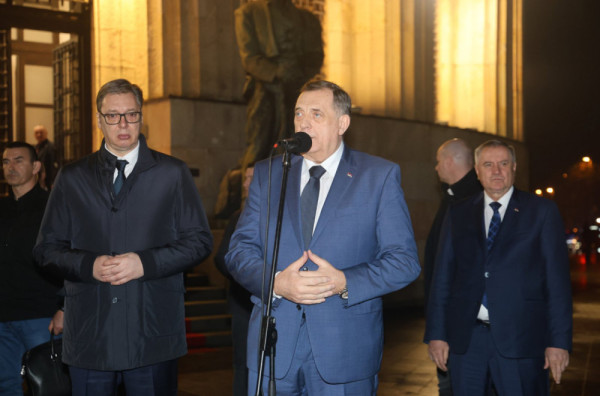 Predsednik Republike Srpske Milorad Dodik dočekao je večeras ispred Palate Republike u Banjaluci predsednika Srbije Aleksandra Vučića i istakao da je njegova i podrška Srbije važna za RS koja želi da sačuva svoja ustavna prava.