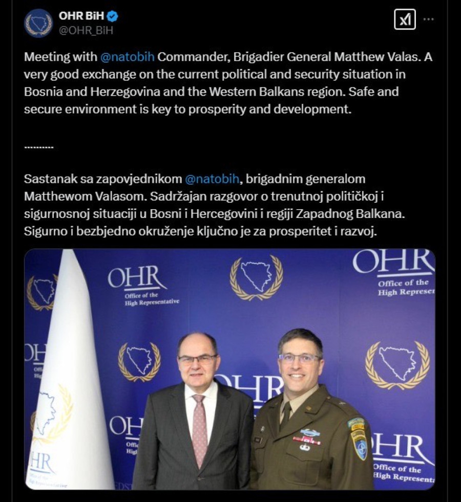 "Sastanak sa komandantom @natobih, brigadnim generalom Metjuom Valasom. Sadržajan razgovor o trenutnoj političkoj i bezbednosnoj situaciji u Bosni i Hercegovini i regionu Zapadnog Balkana. Sigurno i bezbedno okruženje ključno je za prosperitet i razvoj", napisao je Šmit na društvneoj mreži Iks.