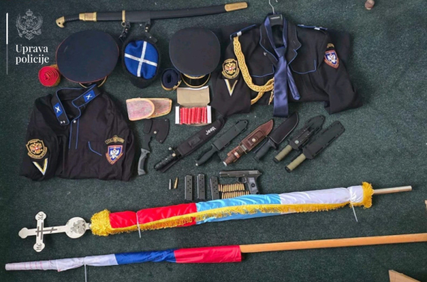 "Pretresom stambenih i drugih prostorija koje koristi D.S, policija je pronašla i oduzela: vazdušnu pušku bez potrebne dokumentacije, više komada vojne uniforme, pancire, šlemove, uniforme Kozačkog bratstva, uređaje za komunikaciju, SIM kartice, članske karte, veći broj računa i uplatnica, uverenje o državljanstvima i pasoše stranih država, knjižicu za učešće na frontu, dokaz o posedu vredne nekretnine, kao i milion i po evra na računu", saopšteno je iz MUP-a.