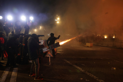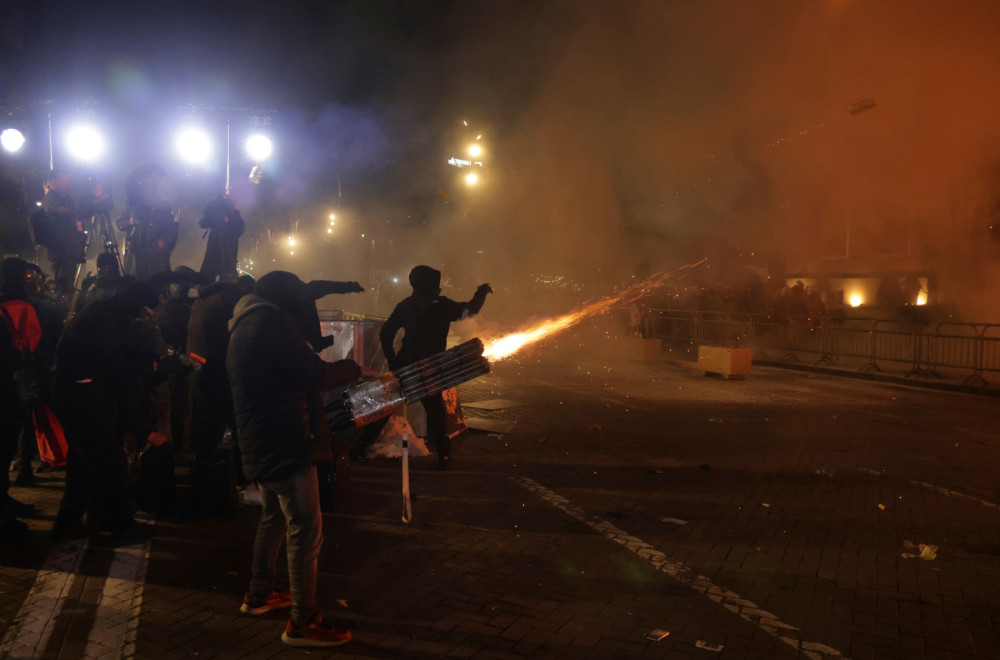 Demonstranti su potom krenuli ka parlamentu, gde su počeli da bacaju Molotovljeve koktele i na zgradu i na policajce, a plamen je zahvatio i jedan automobil.