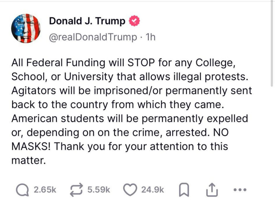 "Sva savezna finansiranja će biti UKINUTA za svaki koledž, školu ili univerzitet koji dozvoli ilegalne proteste. Agitatori će biti zatvoreni i/ili trajno deportovani u zemlju iz koje su došli. Američki studenti će biti trajno izbačeni ili, u zavisnosti od zločina, uhapšeni. BEZ MASKI! Hvala vam na pažnji po ovom pitanju", napisao je Tramp na svojoj društvenoj mreži Istina.