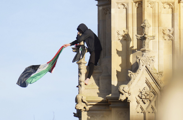 Muškarac, koji se jutros sa palestinskom zastavom popeo se na kulu Elizabeta Vestminsterske palate na kojoj se nalazi Big Ben, i dalje se nalazi tamo krvavih stopala.