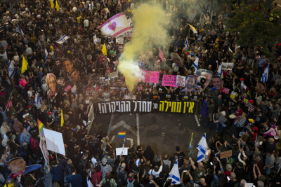 Desetine hiljada demonstranata okupilo se u Jerusalim u protestujući zbog namere premijera Benjamina Netanjahua da se uklone ključni bezbednosni i pravosudni zvaničnici, kao i zbog prekida primijrja u Pojasu Gaze.