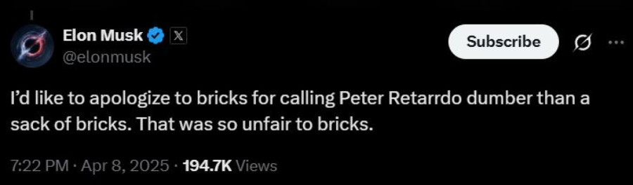 "Želeo bih da se izvinim ciglama što sam Pitera Retarda nazvao glupljim od vreće cigli. To je bilo tako nepravedno prema ciglama", napisao je Mask, odgovarajući na jednu od objava o Navaru.