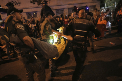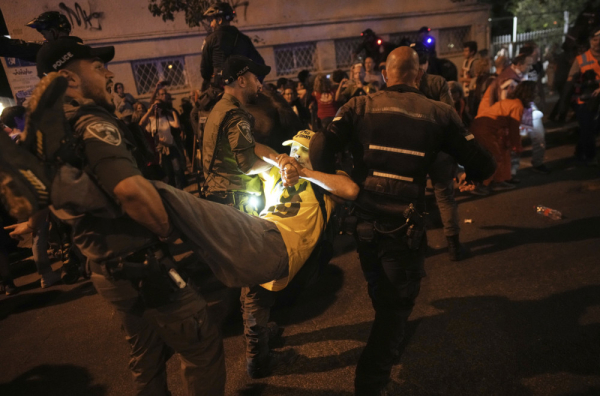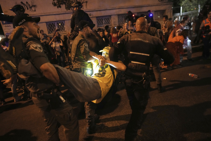 Na snimcima sa lica mesta vide se demonstranti u narandžastim kombinezonima i maskama sa likom Netanjahua, dok ih policajci odvlače sa kolovoza.