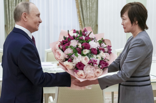 U objavi Kremlja stoji i fotografija na kojoj se vidi da je udovica japanskog premijera dočekana uz veliki buket cveća.