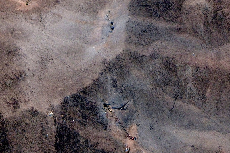 Na snimcima od 29. juna vide se bager i kran na vrhu novog pristupnog puta u blizini mesta pogođenog tzv. bunker-bombama.