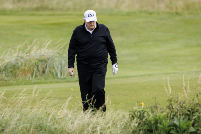 U međuvremenu, Tramp je otišao na golf teren u Tarnberiju na jugozapadu Škotske, gde se nalazi pod budnim nadzorom snaga bezbednosti.