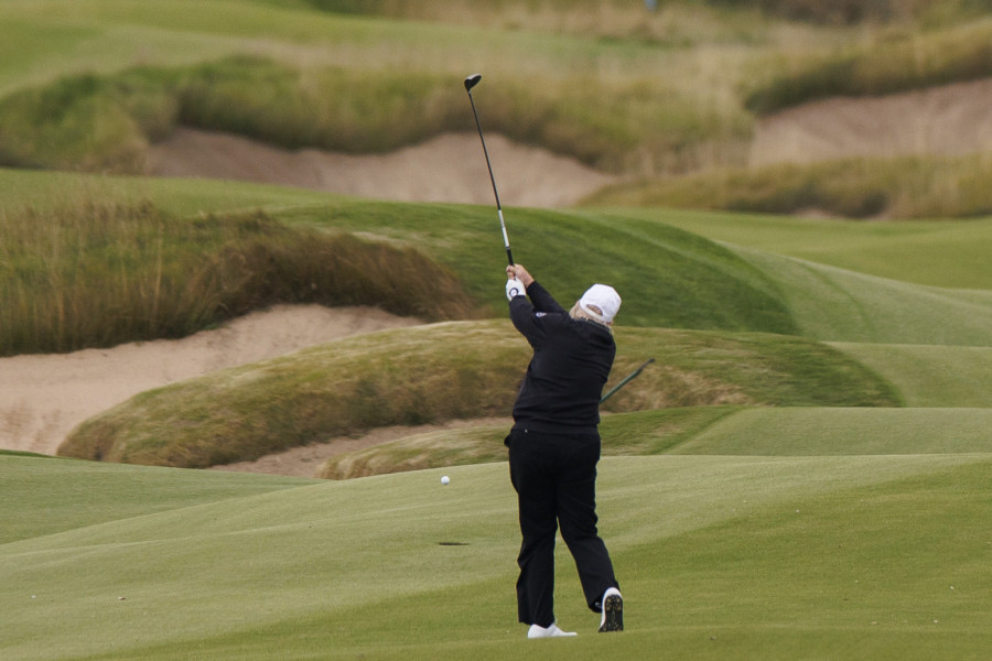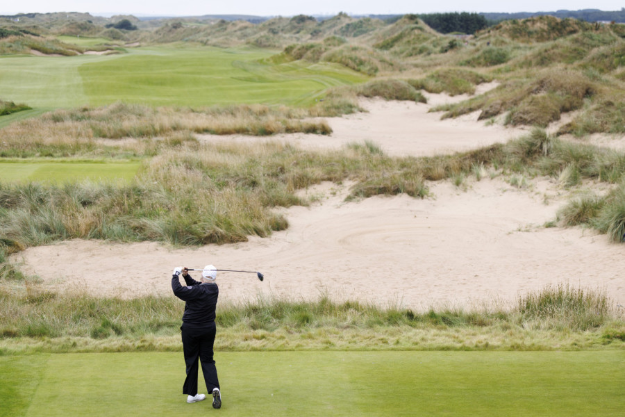 Tramp je otpočeo igru na Novom terenu u Menijeu, Aberdinšir, pred publikom u kojoj su bili golferi, škotski premijer Džon Svini i lider škotskih laburista Anas Sarvar.