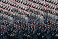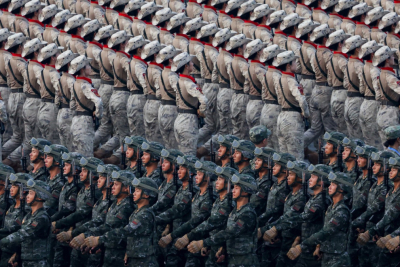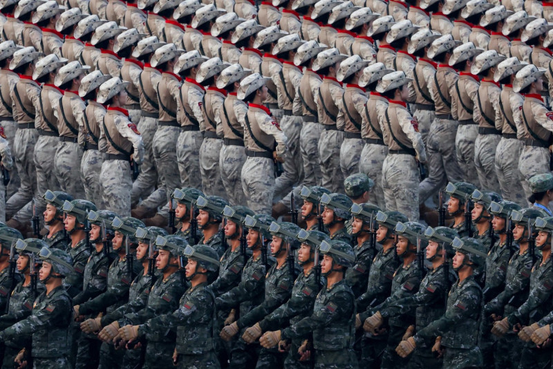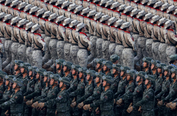Uz glasnu vojnu muziku, Si je izvršio smotru pešadijskih, zastavnih i naoružanih formacija, dok su vojnici uzvikivali "Pratite Partiju! Borite se za pobedu", kao i "Pravda će pobediti", "Mir će pobediti", "Narod će pobediti", prenosi Sinhua.
