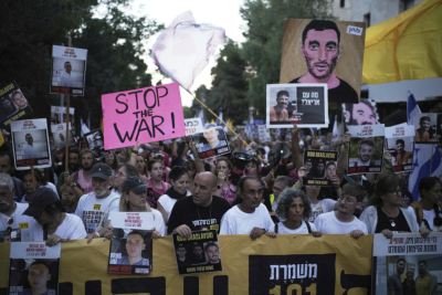Protestna organizacija "Braća po oružju" saopštila je da su stotine demonstrirale ispred doma ministra Rona Dermera, gde su istakli transparent s porukom: "48 talaca, Dermer 0."