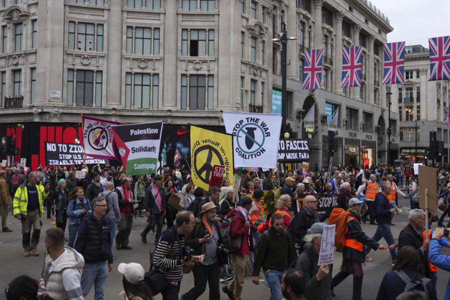 Učesnici protesta nose transparente "Zaustavite rat", "Zaustavite rasističke reforme u VB", "Zaustavite mržnju", "Ne okrutnosti, ne fašizmu, ne korupciji", "Ne fašizmu, ne Trampu", kao i transparente na kojima je slika Trampa sa cuclom u ustima, kao i balone u obliku Trampovog lika u pelenama.