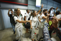 Porodice, prijatelji i pristalice okupili su se da pozdrave aktiviste sa cvećem i zastavama nakon nekoliko dana pritvora u Izraelu.
