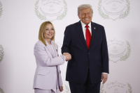 Dok je govorio, drugi svetski lideri, uključujući italijansku premijerku Đorđu Meloni, stajali su iza njega. U jednom trenutku, okrenuo se ka njoj i rekao: "Imamo prelepu mladu ženu. Ako u Sjedinjenim Državama upotrebite reč 'lepa', to je kraj vaše političke karijere."