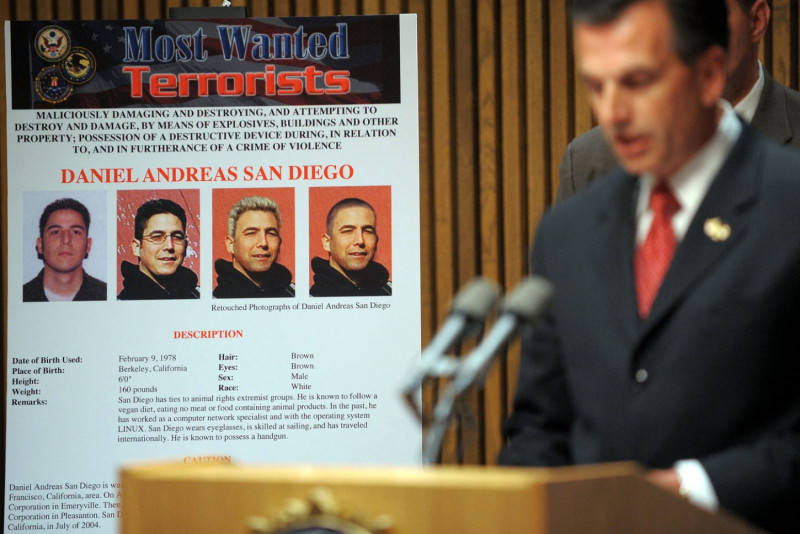 San Diego (47) navodno je izveo dva bombaška napada u San Francisku 2003. godine, za koje je odgovornost preuzela grupa za prava životinja, a uhapšen je u novembru 2024. na imanju u ruralnom području pored šume u Konviju, u severnom Velsu, gde je živeo pod lažnim identitetom kao Deni Veb.