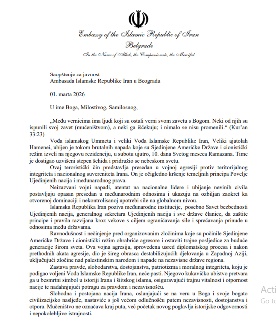 Iranski vrhovni vođa ajatolah Ali Hamnei ubijen je u jučerašnjem velikom napadu na Iran koji su pokrenuli Izrael i Sjedinjene Države. Američki predsednik Donald Tramp zapretio je da će napasti Iran silom "kakva nikada ranije nije viđena" ako napadi eskaliraju.