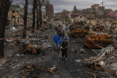 U aprilu 2022. godine, scene užasa događale su se duž Vokzalne ulice. Komadi odeće i ono što je izgledalo kao pojedinačni ljudski udovi visili su sa grana ugljenisanog drveća. Gotovo sve kuće su uništene. Uništena ruska vojna oprema ležala je razbacana pored puta. U podrumu dečijeg kampa pronađena su tela sedam mučenih muškaraca. Snage bezbednosti ih pakuju u crne džakove.
