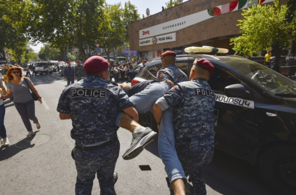 Policija je danas uhapsila najmanje 29 ljudi zbog nasilnih protesta ispred zgrade Ministarstva spoljnih poslova Jermenije u Jerevanu.