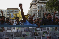 Demonstranti su nosili transparent sa fotografijama migranata nestalih u tom brodolomu čija tela nisu pronađena.