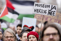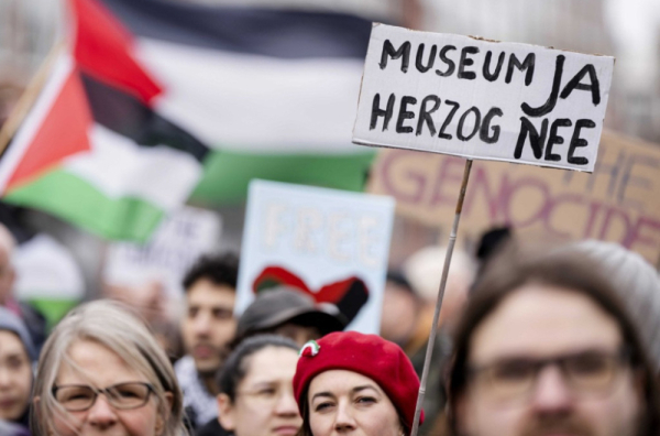 Organizacija za zaštitu ljudskih prava Amnesti internešenel postavila je znakove oko muzeja kako bi Hercoga uputila na Međunarodni sud pravde u Hagu kojem je Južna Afrika uputila tužbu protiv Izraela za navodni "genocid" u Pojasu Gaze.