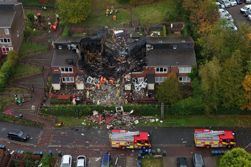 Fotografije uslikane dronom prikazuju srednju kuću u nizu od šest koja je pretvorena u ruševinu, dok su ostale kuće teško oštećene. Spasilac sa psima tragačima pregledao je teren, nakon što su vatrogasci ugasili plamen.