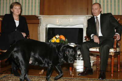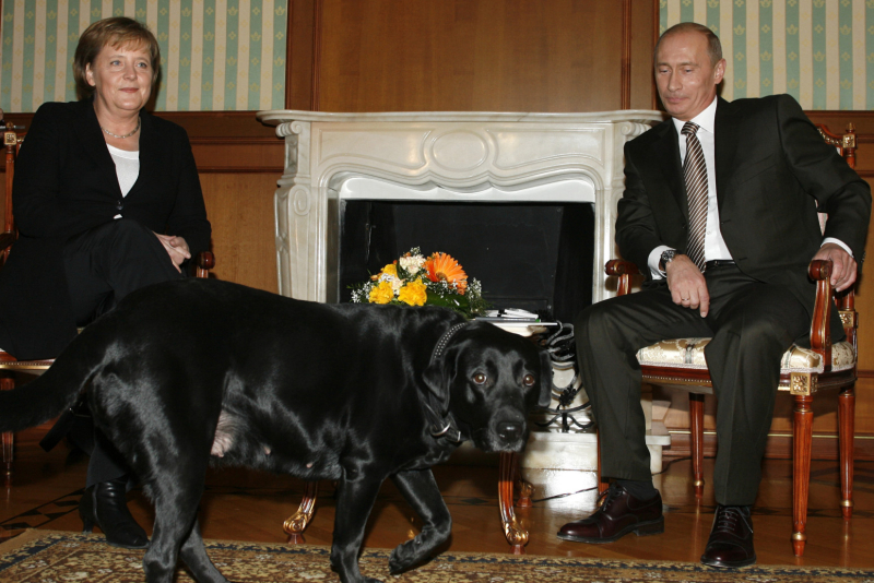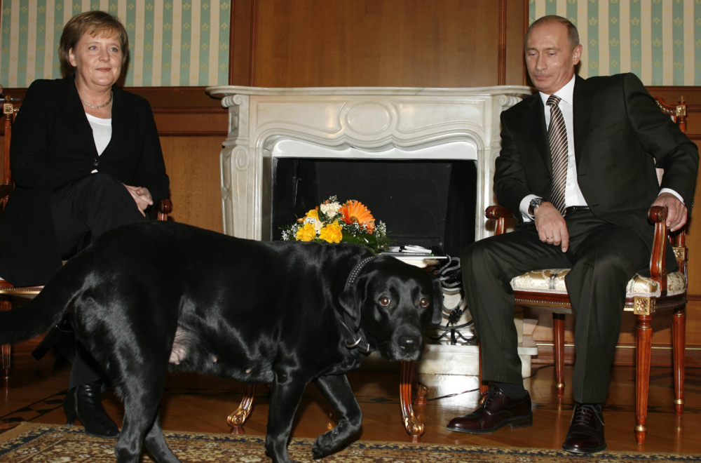Slike sa njihovog sastanka 2007. u ruskom gradu Sočiju prikazuju Putinovog crnog labrador retrivera Konija kako njuška okolo dok je nemačka liderka sedela preko puta, nervozno se smešeći.