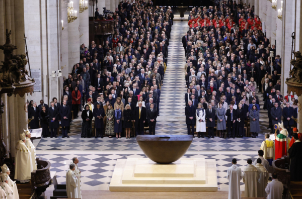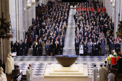 Makron je podsetio na hrabrost vatrogasaca koji su intervenisali 15. aprila 2019. godine da bi obuzdali požar koji je zahvatio Notr Dam, prenela je BFMTV. Zvanice okupljene u katedrali aplauzom su pozdravile 160 vatrogasaca koji su učestvovali u gašenju požara. Pariski nadbiskup Loran Ulrih zahvalio je Makronu na zalaganju za rekonstrukciju katedrale i ispunjenju obećanja da će Notr Dam biti obnovljen za pet godina.