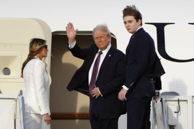 Tramp, Melanija Tramp i njihov sin Baron ulaze u avion američkog ratnog vazduhoplovstva.