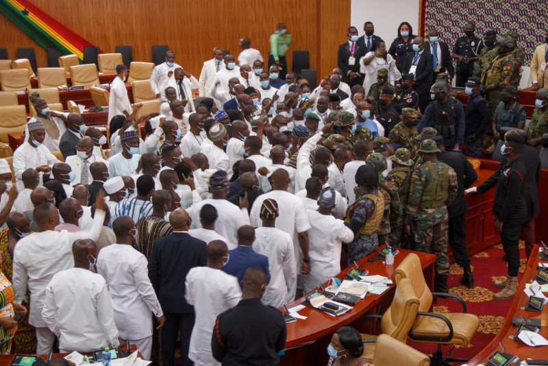 U parlamentu u Gani danas su izbili nemiri, jer su poslanici počeli da uništavaju nameštaj i upuštaju se u fizičke sukobe.