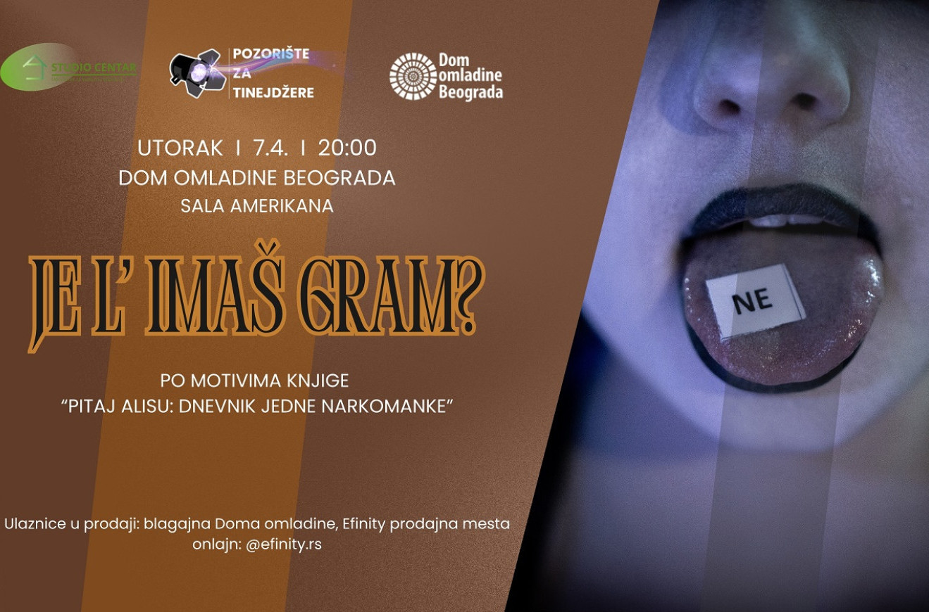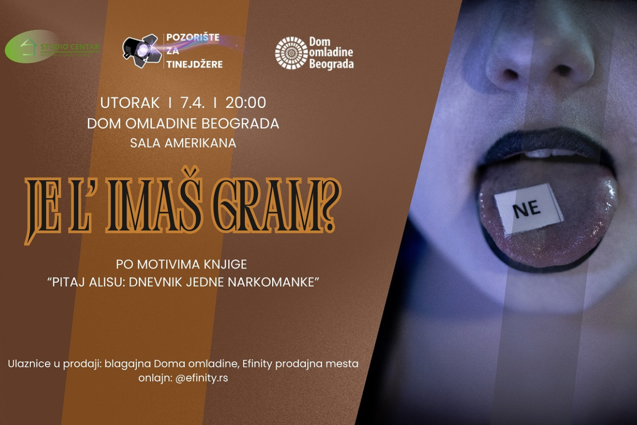 Edukativna predstava za tinejdžere "Je l' imaš gram?" nastala je po motivima knjige "Pitaj Alisu: dnevnik jedne narkomanke" ponovo će se igrati 7. aprila u sali Amerikana Doma omladine Beograda.
