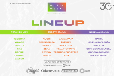 Najveći festival popularne muzike u organizaciji Skymusic-a, Belgrade Music Week, počinje danas, a tokom tri festivalska dana (od 28. do 30. juna - petak, subota nedelja), očekuju nas nastupi preko 30 domaćih i regionalnih izvođača, među kojima su Rasta, Teodora, Jelena Karleuša, Desingerica, Voyage, Nucci, Đorđe/Klinac, Nikolija, Crni Cerak i mnogi drugi.