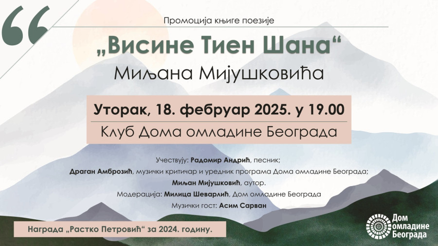 Promocija knjige poezije "Visine Tien Šana" Miljana Mijuškovića održaće se u Domu omladine 18. februara od 19 sati.