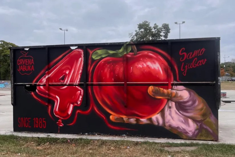 Tako je uoči velikih beogradskih koncerata u skejt parku kod Ušća osvanuo potpuno originalan mural posvećen legendarnom sastavu Crvena jabuka, na kom je vešto naslikan simbol benda: velika crvena jabuka i broj 4 koji uz jabuku simbolično označava 40 godina benda.