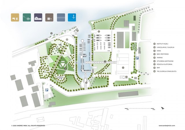 Velika zelena površina postaje oaza parkova sa šetalisnim i biciklističkim stazama, amfiteatrom open air, paviljonom posvećenim razvoju mladih talenata i pratećim ugostiteljskim sadržajem. Trg pri izlasku na reku posvećen je Đorđu Stanojeviću.
