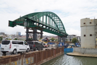 Zeleni luk Starog savskog mosta, koji je juče skinut sa stubova, ostaće na reci narednih mesec dana, privezan na ponton od barži, a toliko će trajati i pripreme za njegovo prebacivanje na obalu, na gradilišni plato u blizini Brankovog mosta.