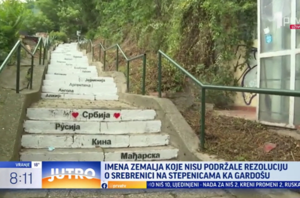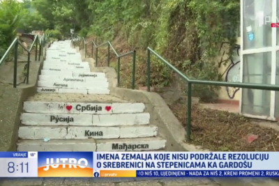 Čuvene stepenice u Zemunu koje vode ka Gardošu ispisane su imenima zemalja koje su glasale protiv Rezolucije o genocidu u Srebrenici ili bile uzdržane tokom glasanja u Generalnoj skupštini UN-a.