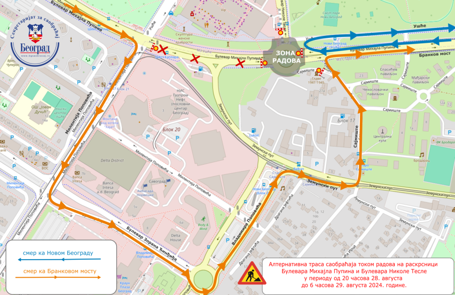 Od 20 sati u sredu, 28. avgusta, do 6 časova u četvrtak, 29. avgusta, biće zatvorena cela raskrsnica, tako da će sva vozila sa Brankovog mosta skretati desno u ulicu Ušće, pa dalje se kretati u smeru Bulevara Nikole Tesle, a Brankovom mostu će se pristupati samo iz ulice Sajmište.