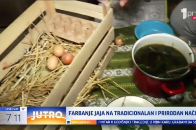 "Mi smo jutros sporanili i tradicionalno sa mojim pilićima, sa komšijama, nabrali travčice. Farbamo ih u ovoj Brvnari koja je stara skoro dva veka, gde su tradicionalno naše bake, prabake ovako farbale jaja. Farbamo ih isključivo u lukovini, u zelju, u čaju, u vinu.