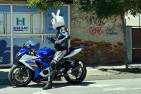 Neobičan prizor zatekao je građane Čačka u samom centru kada su na ulici ugledali bajkera na motoru, u bajkerskom odelu ali sa maskom belog zeke na glavi.