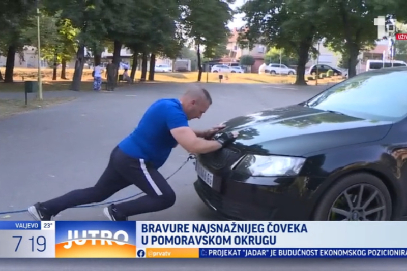 "Pripremio sam vam jedan perfomans koji ćete videti. Probaću da povučem auto od 1.500 kg sa čovekom u autu i sa svojim sinom na sebi na dva prsta. Sin je težak 70 kg, a vozač u automobili oko 100 kg. Kad to saberemo oko 2 tone, otprilike malo manje", kazao je Dejan.