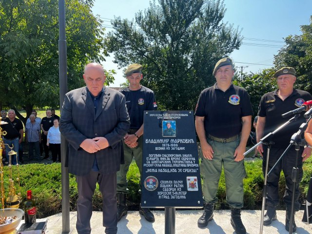 "Savezna Republika Jugoslavija, koju su tada činili Srbija i Crna Gora nije vodila osvajački rat na Kosovu i Metohiji, već odbrambeni rat od albanskih terorista i NATO pakta i još nekih država čiji je cilj bio otimanje srpske teriitorije. Međunarodno pravo se kršilo tada i krši se i danas. Najmoćnije države dizanjem ruku donose odluke, a ne po međunarodnom pravu. Ali danas mnogo manje država priznaje takozvano nezavisno Kosovo nego pre 11, 12 godina, zahvaljujući predsedniku Srbije Aleksandru Vučiću i ministru spoljnih poslova Ivici Dačiću. 25 država je povuklo priznanje te lažne države. Siguran sam da niko od srpskih politčara nikada neće priznati takozvano nezavisno Kosovo. Stalno se traži od Srbije da to potpiše, pristisci su svakodnevni, ali to se neće desiti. To nikada neće podržati Jedinstvena Srbija, a siguran sam ni SPS ni Srpska napredna stranka. Tim pristicima velike sile zapada žele da odbrane i opravdaju agresiju na našu zemlju 1999. godine. Mi ćemo nastaviti borbu, ali ne puškom već olovkom i istorijom i pravdom. Državno rukovodstvo na čelu sa Vučićem i Dačićem se bori da naša omladina više nikada ne nosi puške, već kompjutere. Rat svakoga dana izaziva Aljbin Kurti, ne samo u Srbiji već i u Severnoj Makedoniji i u toj njegovoj nameri treba da ga spreči međunarodna zajednica. Naša je dužnost da svakom od poginulih boraca za slobodu i odbranu otadžbine ukažemo čast i poštovanje, tako i Vladimiru Markoviću", istakao je Dragan Marković Palma.